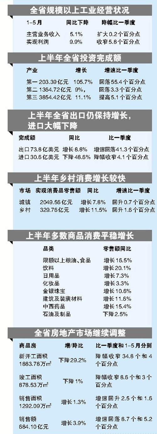 發(fā)布會上,統(tǒng)計局相關負責人表示,今年上半年,全省經(jīng)濟運行經(jīng)歷了一季度的低迷后,在各項穩(wěn)增長政策的有力作用下,各項經(jīng)濟指標從二季度開始回歸到平穩(wěn)增長的軌道,并呈現(xiàn)企穩(wěn)回升向好的積極態(tài)勢。但穩(wěn)增長壓力依然較大,經(jīng)濟回升的基礎仍有待夯實。隨著狠抓穩(wěn)增長、促改革、調(diào)結構、惠民生、防風險政策措施的落實到位,第三季度將進一步鞏固經(jīng)濟運行回升向好的勢頭,第四季度向著全年預期發(fā)展目標攻堅沖刺,努力實現(xiàn)各項目標任務。